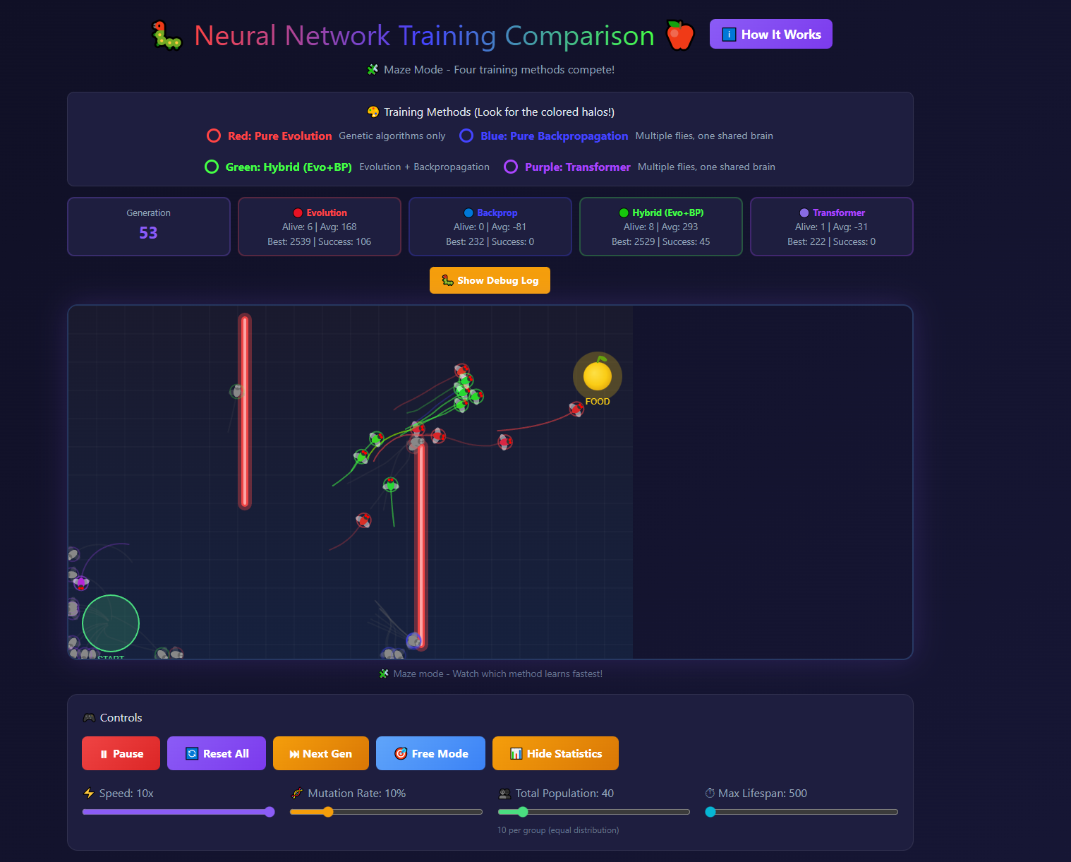 We shared it once during development, and it received 14 upvotes on Hacker News. We wanted to see flies evolve to reach food through obstacles, so subsequent to the release of that version, we simplified the maze to be a simpler obstacle course.